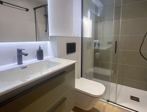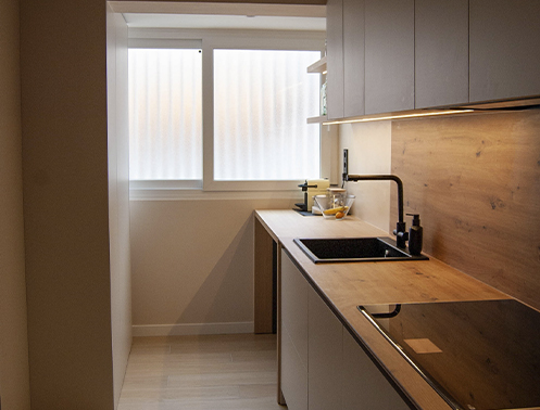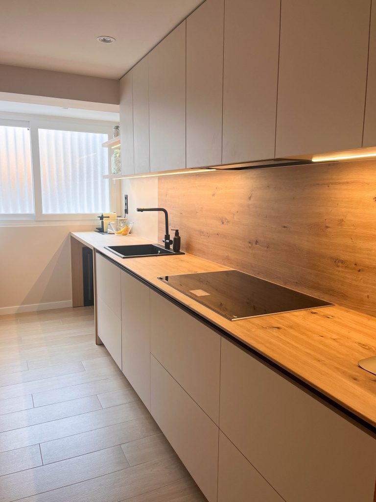Reforma integral de la cuina d’aquest habitatge particular, nou paviment ceràmic efecte parquet o reforma integral de bany a Lloret de Mar.